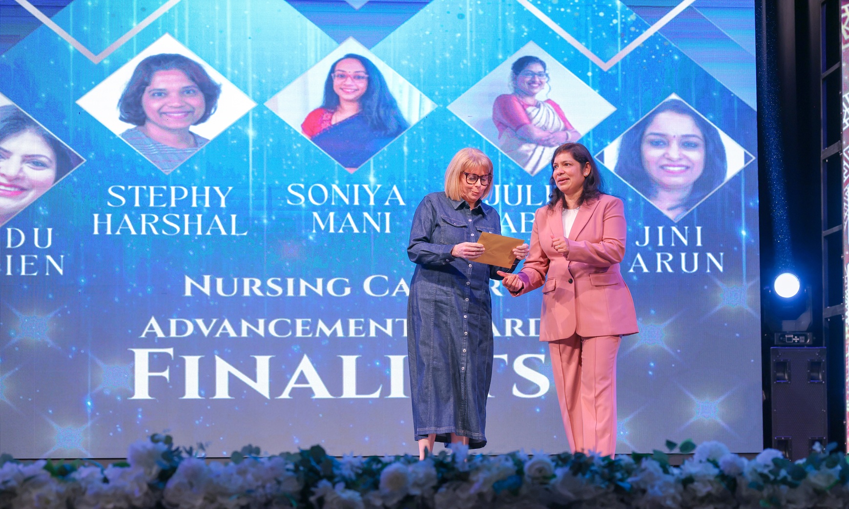 Presenting the award for Nursing Career Advancement From left to right: Nicola Firth (Chief Nurse, Stockport NHS Foundation Trust) and Bindhu Mathew (Director, Ealoor Group).